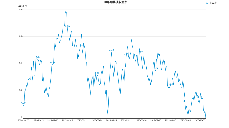 新华财经北京10月17日电美债收益率周四(16日)下跌,截至收盘时,10年期美债收益率跌至4%以下。当天美东交易时段,在费城联储公布弱于预期的经济状况调查后,美债收益率一度全线走低。